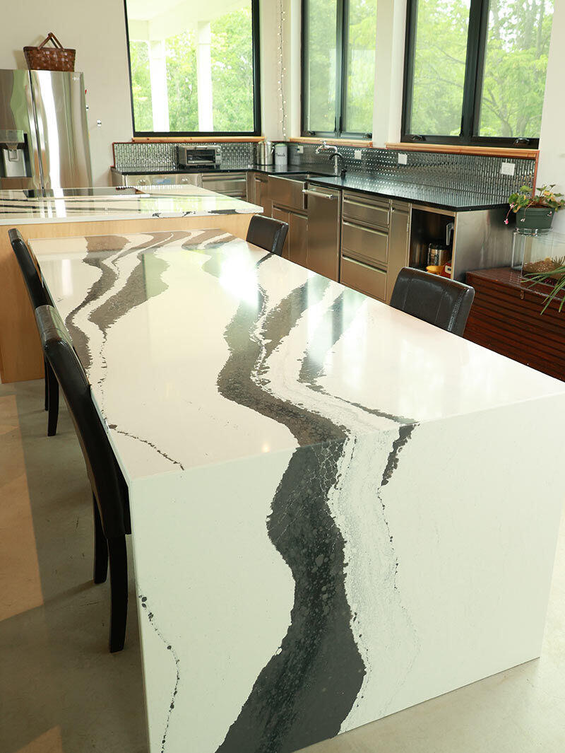 The countertops feature polished Silestone® quartz in Ethereal Noctis with a mitered edge, combining luxurious appearance with exceptional durability. These quartz countertops are perfect for busy kitchens, resisting stains, scratches, and heat while offering timeless style.
